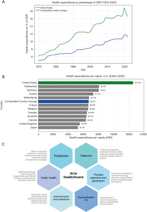 Healthcare spending in the United States (U.S.) continues to rise at an accelerating pace. In 2023, national health expenditures were projected to have grown by 7.5%, surpassing the nominal gross domestic product (GDP) growth rate of 6.1% (1). As a result, healthcare spending as a share of the nation’s economy increased to 17.6% (1) (Figure 1A). According to the annual National Health Expenditure Accounts reports, total U.S. health care spending in 2023 reached approximately $4.9 trillion, equating to $14,570 per person (3) (Figure 1B). Over the full projection period from 2023 to 2032, health spending is expected to grow at an average annual rate of 5.6%, consistently outpacing the nominal GDP growth rate of 4.3% (1). As health care costs continue to rise, policymakers and industry leaders are exploring innovative solutions, including the integration of artificial intelligence (AI), to improve efficiency and reduce expenses (4,5).